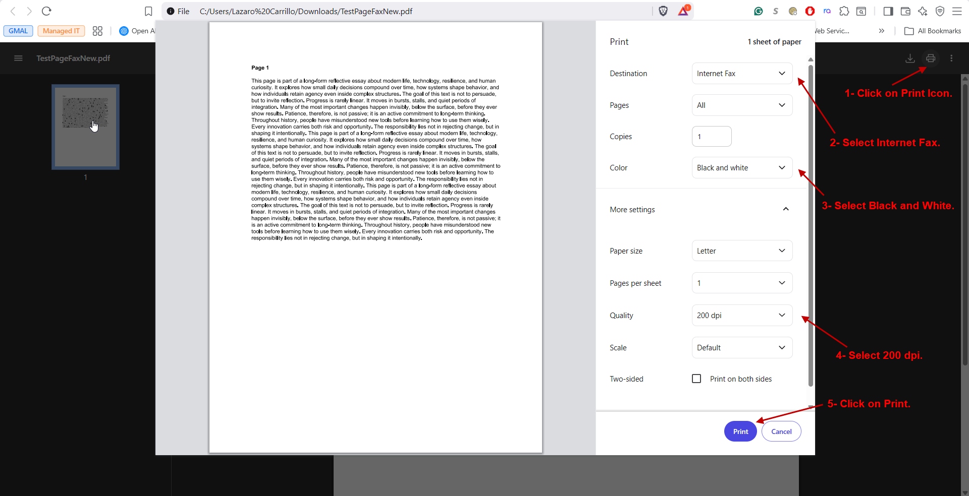 4- Click the Printer Icon in the top right of your document and select Internet Fax as your printer. Select Advanced Settings and choose 200 dpi. Click Print at the bottom.